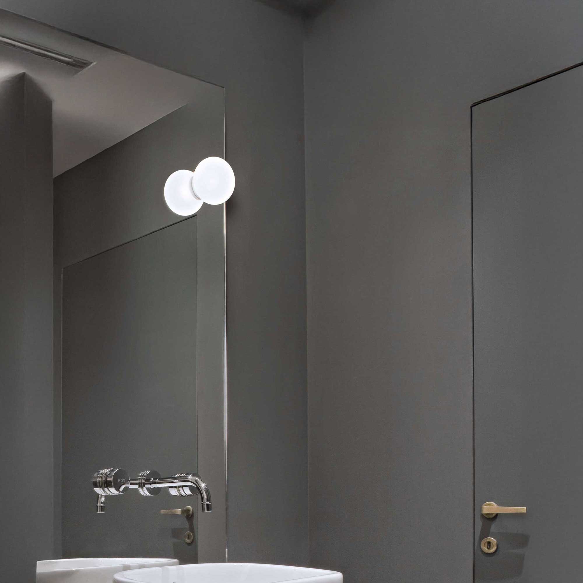 Mini Glo-Ball на италианската марка Flos е дизайнерско осветително тяло, проектирано от Джаспър Морисън, което осигурява мека и равномерно разсеяна светлина, идеална за монтаж върху огледало. Разсейвателят на осветителното тяло е изработен от ръчно духано трислойно опалово стъкло, чиято външна повърхност е матирана с киселина, което създава меко и приятно светлинно излъчване без отблясъци.