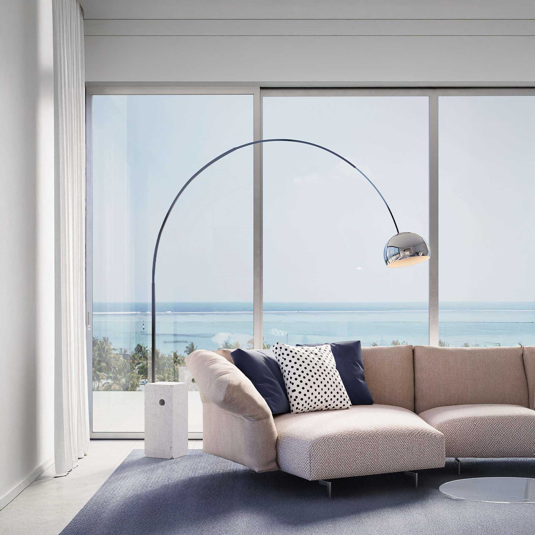 Лампата Arco на Flos е емблематична подова лампа с директна светлина, проектирана от известните италиански дизайнери Ахиле и Пиер Джакомо Кастильони през 1962 г. Лампата има основа от бял мрамор от Карара, телескопична стойка от неръждаема стомана с матово покритие и въртящ се, регулируем на височина рефлектор от полиран алуминий със защитно лаково покритие. Благодарение на елегантната си дъговидна форма лампата може да се постави в пространството, без да е необходим монтаж на тавана. Лампата използва LED технология с температура на хроматичност 2700К, светлинен поток 1224 lm и входяща мощност 28 W.