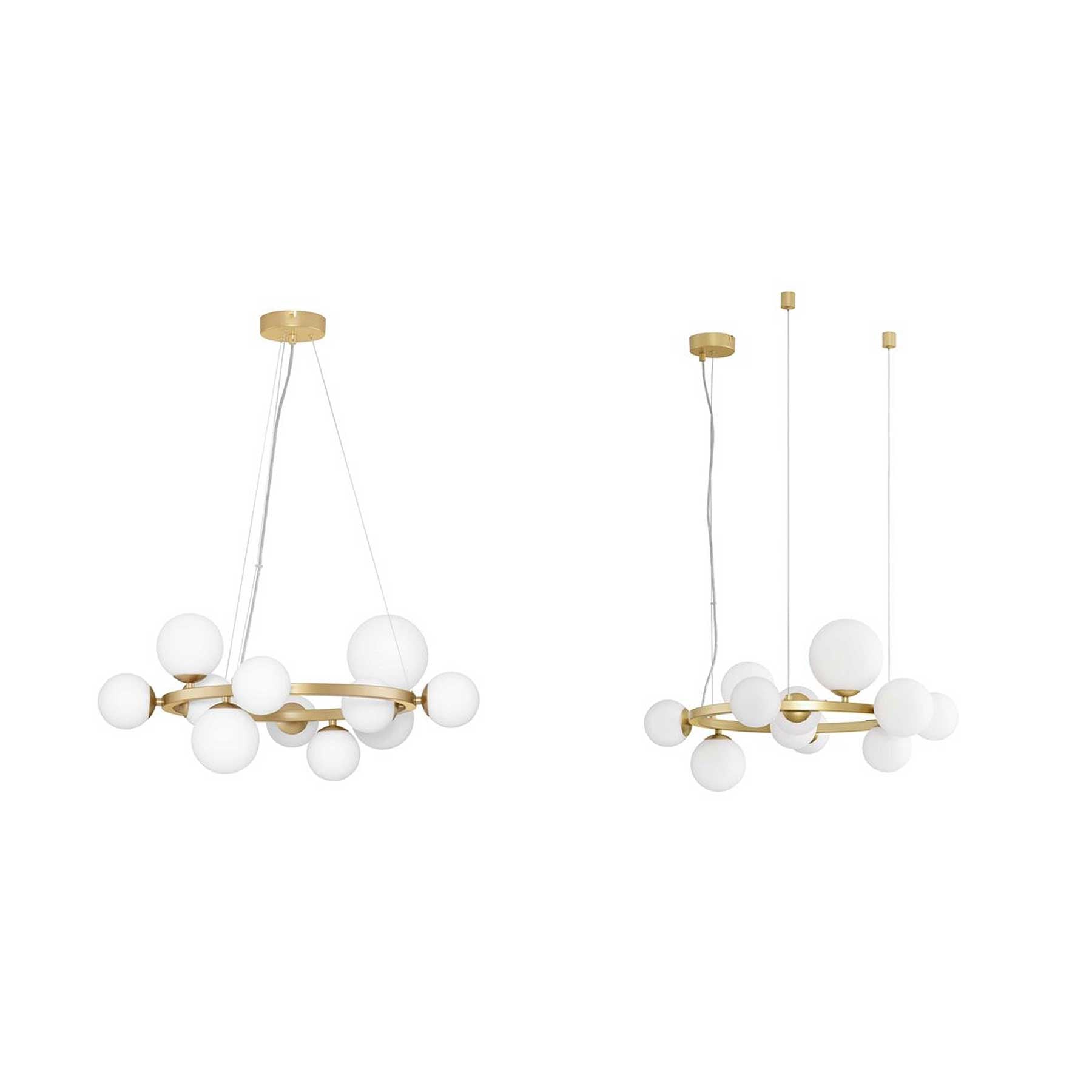 Висящият стъклен полилей от колекцията Odillia на Nova Luce е модерен и елегантен полилей с кръгла рамка и стъклени сфери в стил "балон", които придават на интериора игрив, но изискан вид. Осветителното тяло разполага с 11 цокъла G9 за светодиодни крушки, които осигуряват достатъчно осветление дори в по-големи пространства, като се предлага в три варианта на стъкло - прозрачно, димно и опалово. Освен това версиите от прозрачно и опалово стъкло предлагат универсална система за окачване от една розетка или поотделно, което позволява гъвкава височина и стил на монтаж. Със своя изчистен и непреходен дизайн полилеят Odillia е подходящ за модерни всекидневни, трапезарии, хотелски фоайета и офиси, където действа не само като източник на светлина, но и като отличителен дизайнерски елемент.