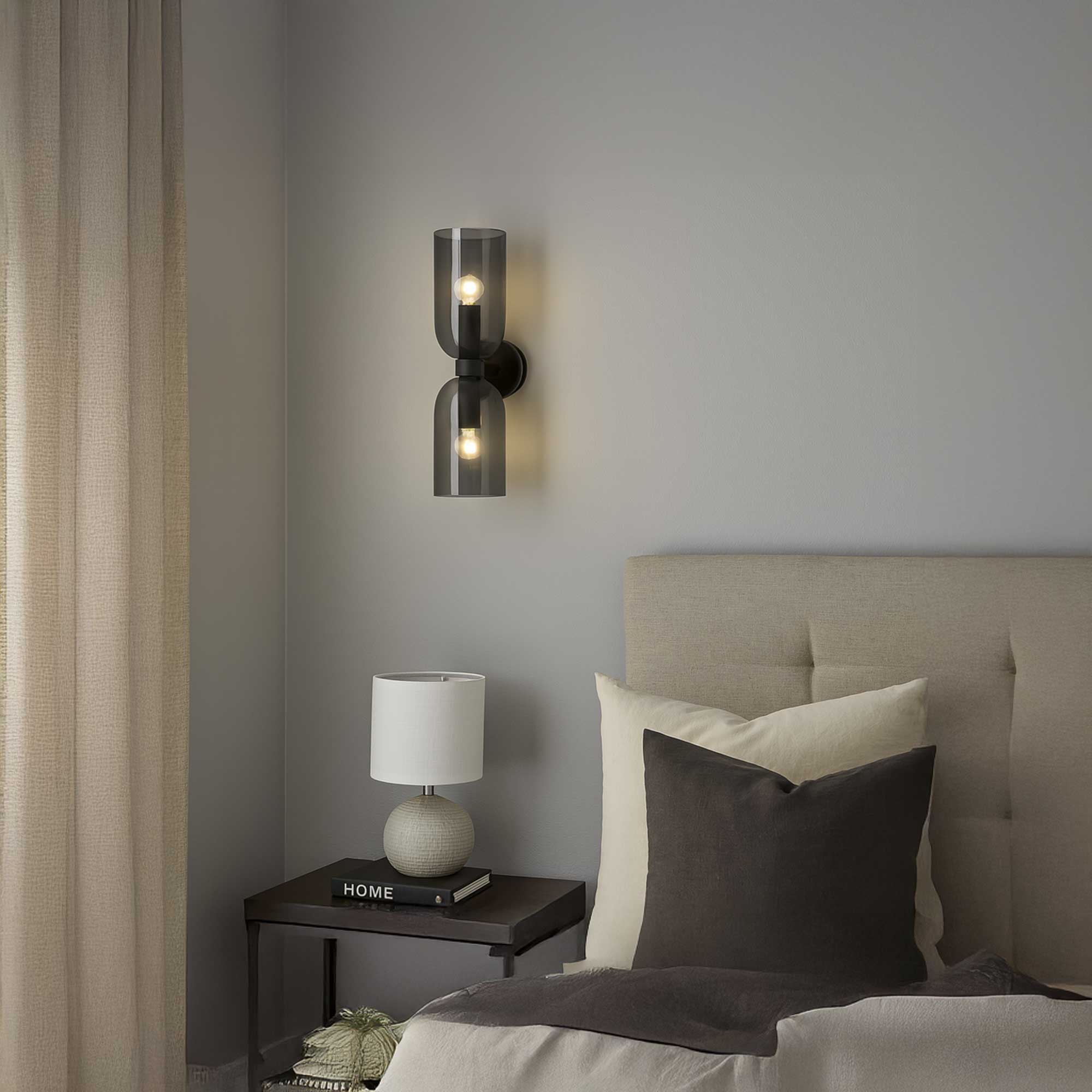 Стенната лампа Palmer на гръцката компания Nova Luce впечатлява с модерния си и елегантен външен вид, състоящ се от двойка противоположни абажури от опушено стъкло, допълнени от черни метални детайли. Лампата е снабдена с фасунга 2× E27, която позволява да се избира интензитетът и характерът на светлината в зависимост от използваните крушки, и е идеално подходяща за спалнята, всекидневната, коридора или стилните търговски помещения, където може да служи като декоративен и практичен осветителен елемент.